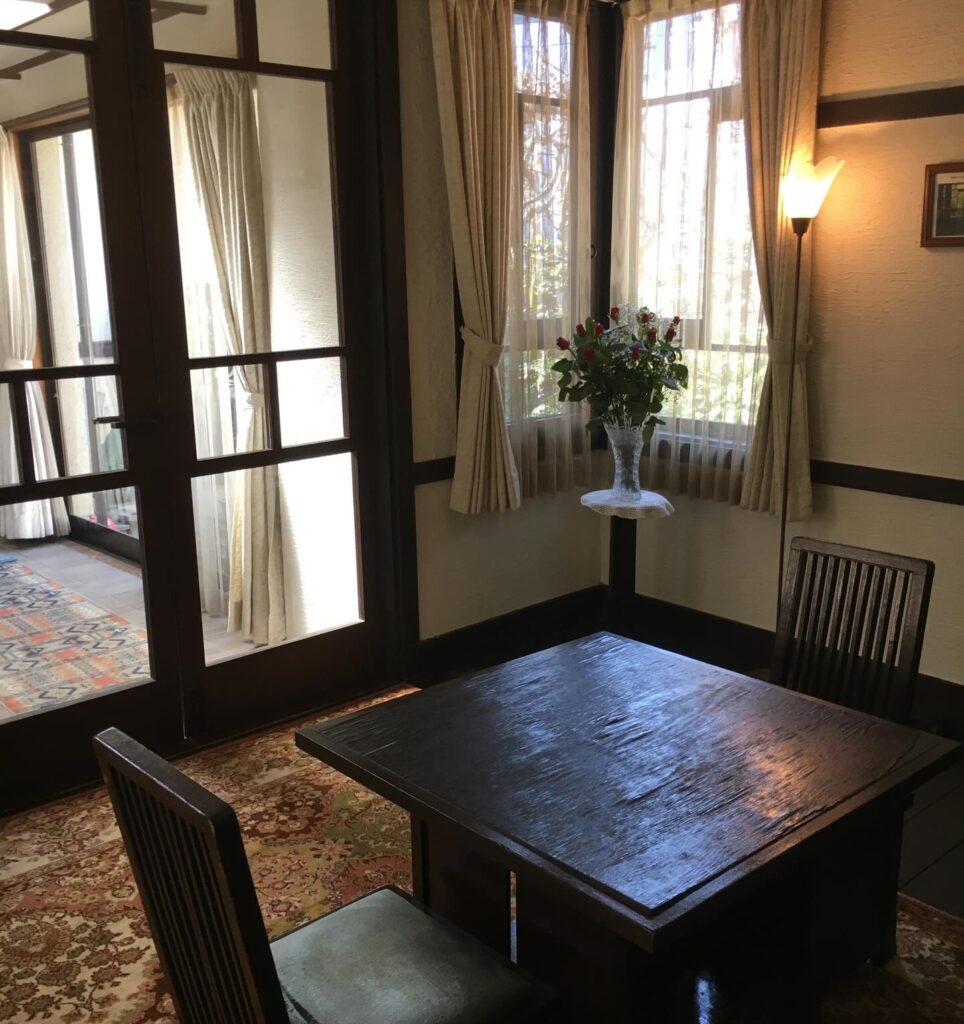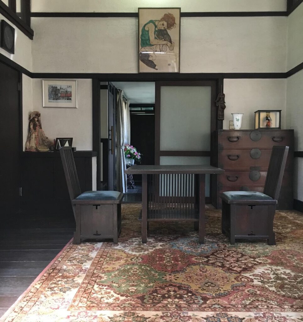 室内に置く家具までを全て建築家がデザインする手法は遠藤新が師匠のフランク・ロイド・ライトに習った「全一」と言われる手法ですが、この居間のために遠藤新は二脚の椅子と机をデザインしています。